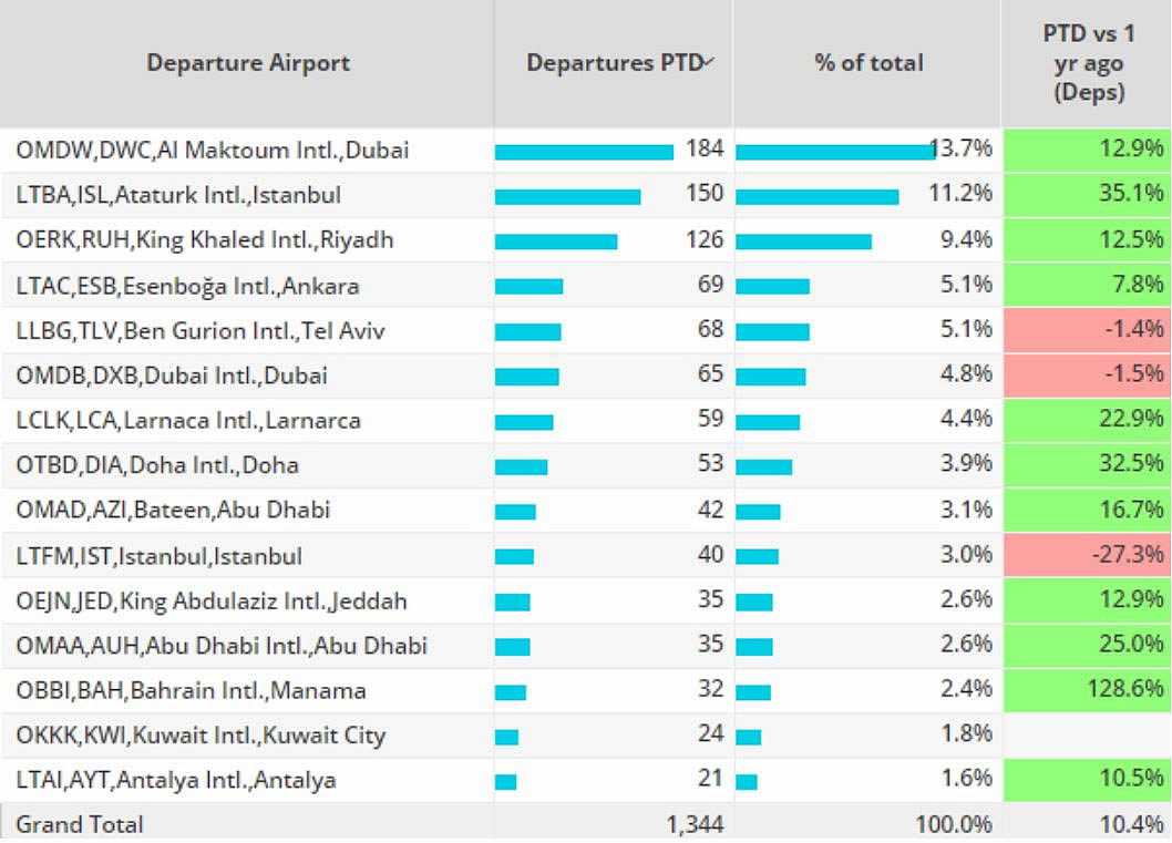 Middle East business jet airports, Week 2 2024 compared to the same dates in 2023.