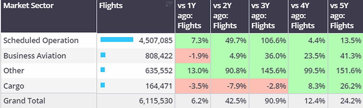 So far this year, business jet activity in Europe is just 2% ahead of comparable 2019, whilst scheduled airline sectors are 17% below comparable 2019.