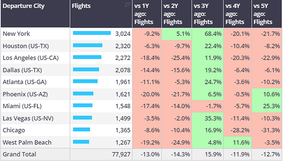 US Corporate Flight Department bizjet departures by city, 1st January – 25th February 2024 compared to previous years.