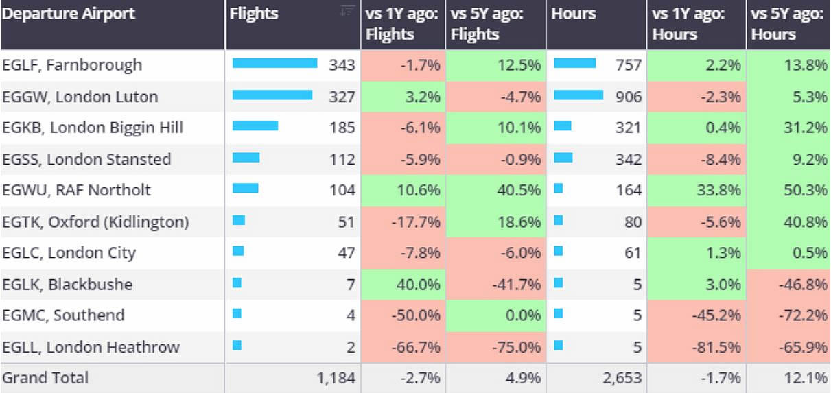 Business Jet departures from London airports 1st-10th March 2024 vs previous years.