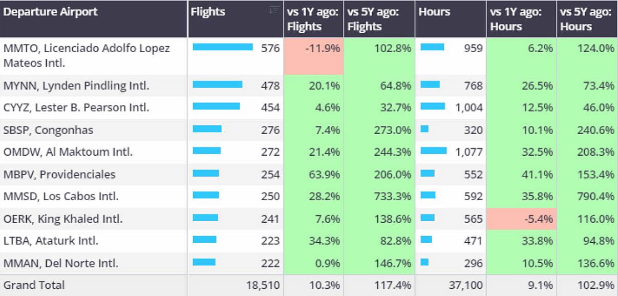 Branded Charter fleets are flying more domestic routes than the last 5 years, private flight departments 39% less than last year.