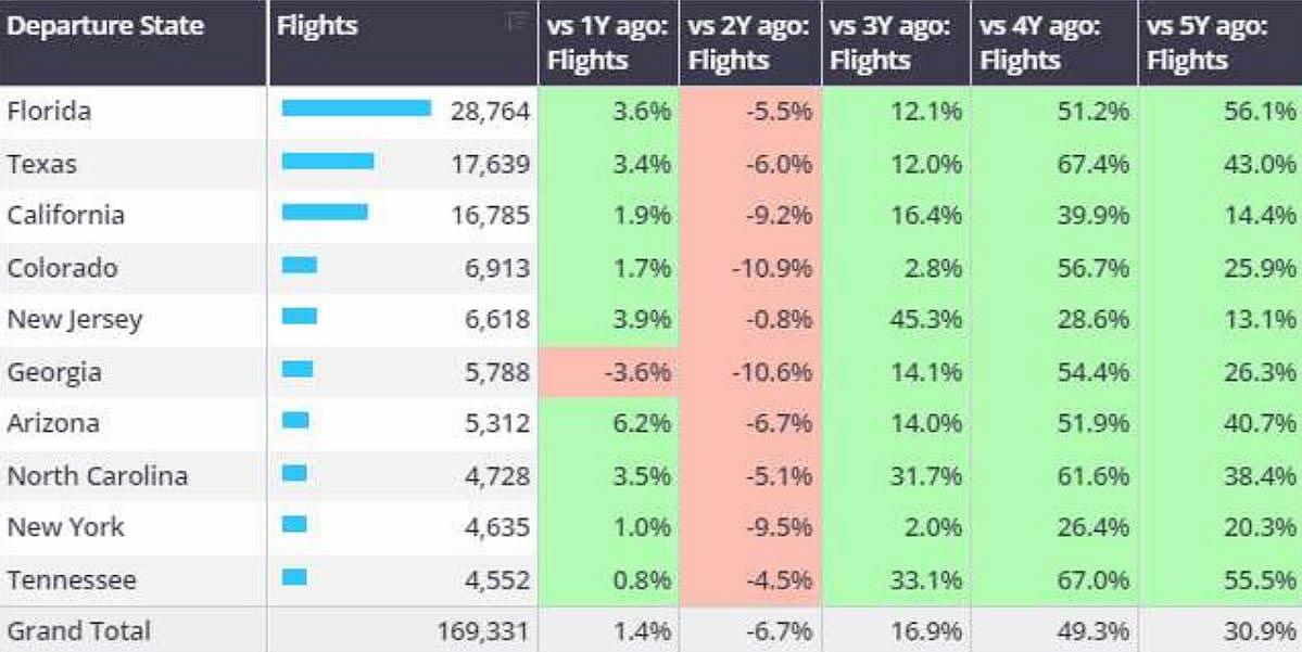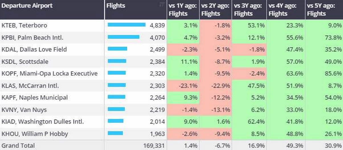 US Bizjet departures by airport, 1st-24th March 2024 vs previous years.