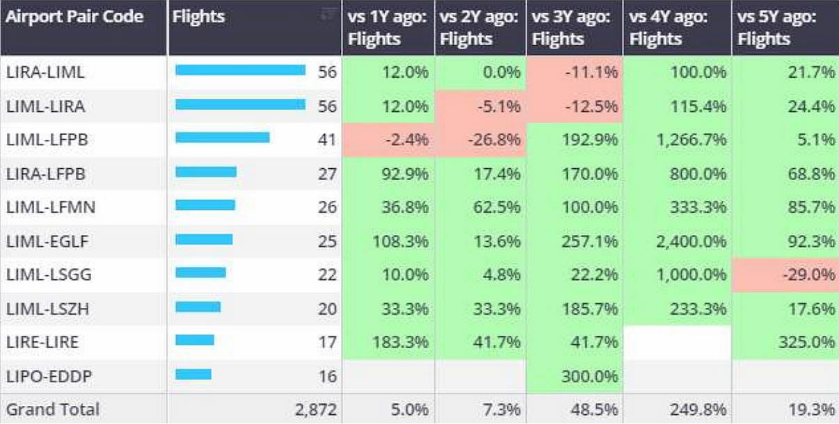 Top airport pairs, bizjet departures from Italy, 1st-24th March 2024 vs previous years.