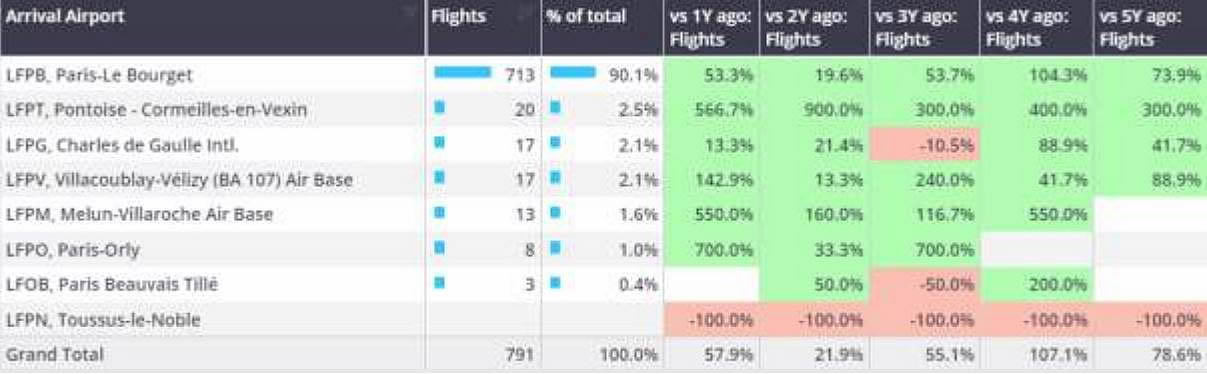 Bizjet arrivals into Paris airports, Week 30 2024 (% change refers to change vs same dates last year).