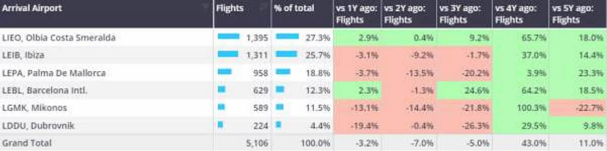 Bizjet arrivals into select European holiday destinations, July 1st-29th vs previous years.