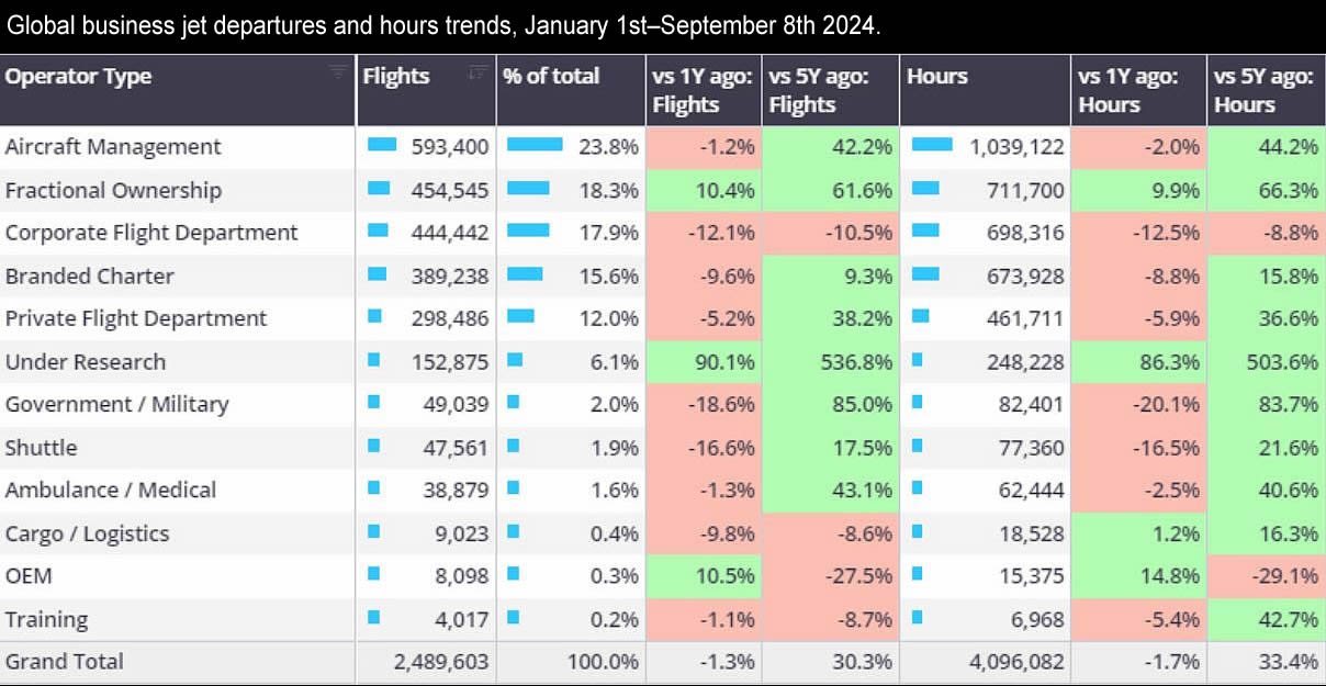 Global business jet departures and hours trends, January 1st–September 8th 2024.