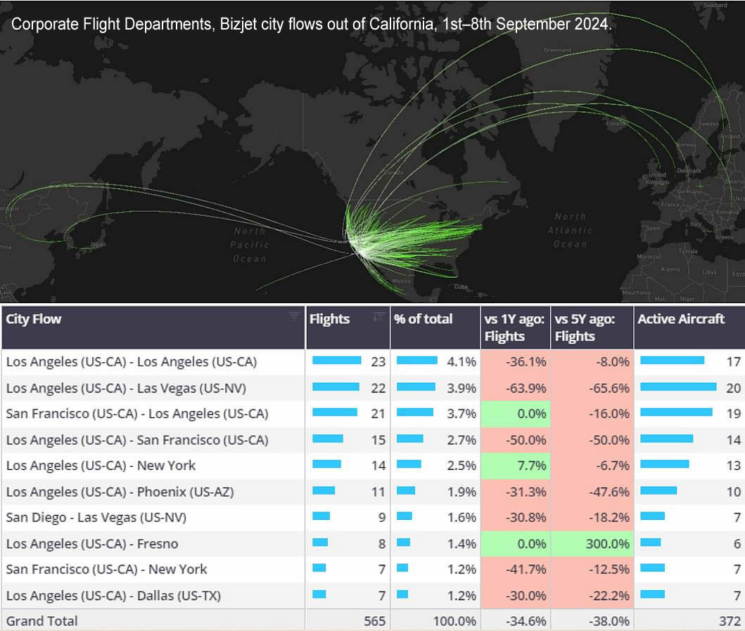 Corporate Flight Departments, Bizjet city flows out of California, 1st–8th September 2024.