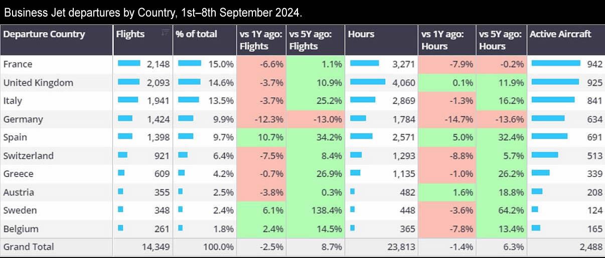 US Bizjet activity from January through to 8th September is 1% behind last year, 27% ahead of comparable 5 years ago. At the start of September, activity is slowing down, departures down 6% compared to the same 8 days in September 2023.