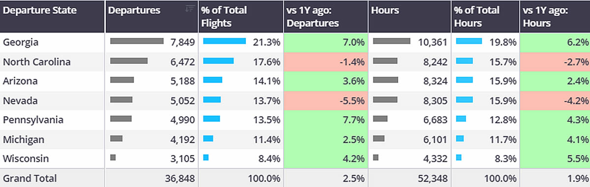 In the run up to the US election, business jet activity in the key Swing States over the last four weeks were mostly well ahead of last year. In Pennsylvania, several cities saw large gains, with Williamsport up 38% year on year, State College up 61% increase and Altoona up 76% increase.