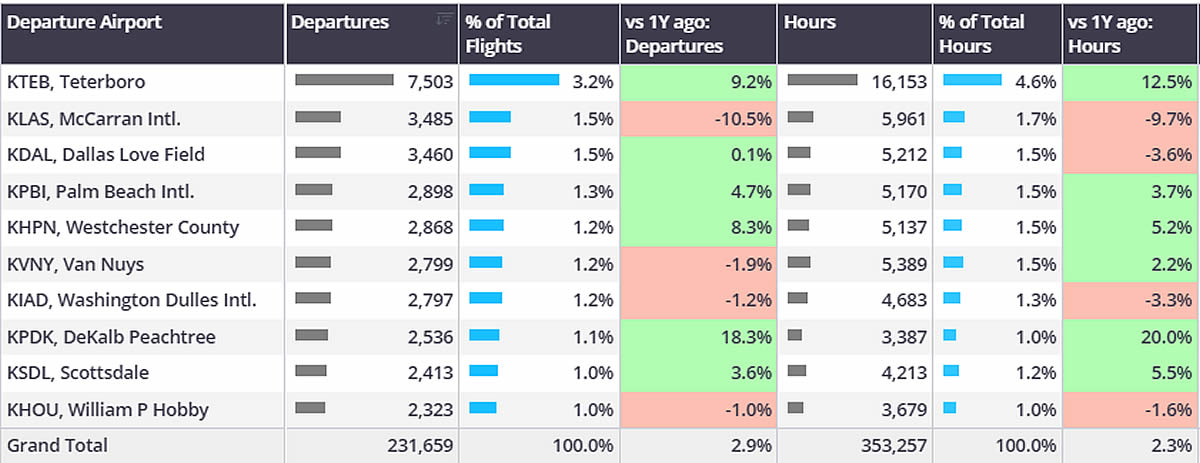 Business jet departures by US airport in October 2024.