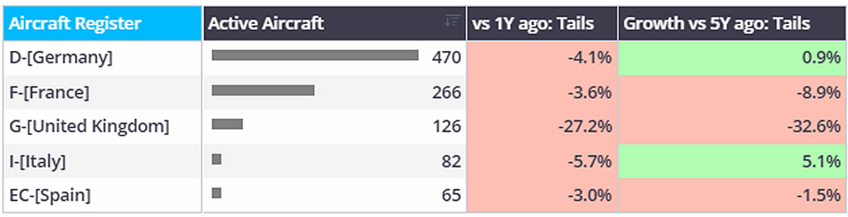 In terms of fleet size, the German registered fleet is slightly up on 2019, in contrast to a notable decline in France-registered jets over the last 5 years, and a startling 33% drop in the G Register bizjet fleet over the same period.