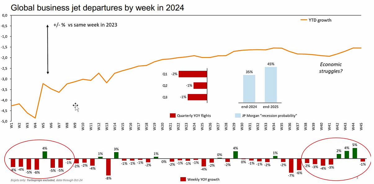 Despite the tapering off in Week 45, the four-week trend is solid, trending 3% ahead of last year. The recent upwards trend contrasts with a marked slowdown after the summer. For 2024 to-date, global bizjet activity is down by 1%.