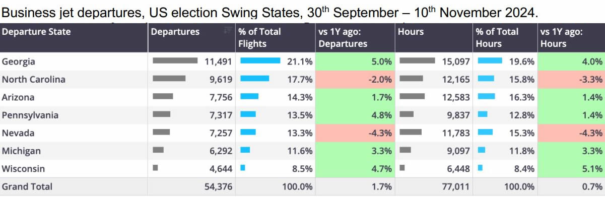 Business jet departures, US election Swing States, 30th September-10th November 2024.
