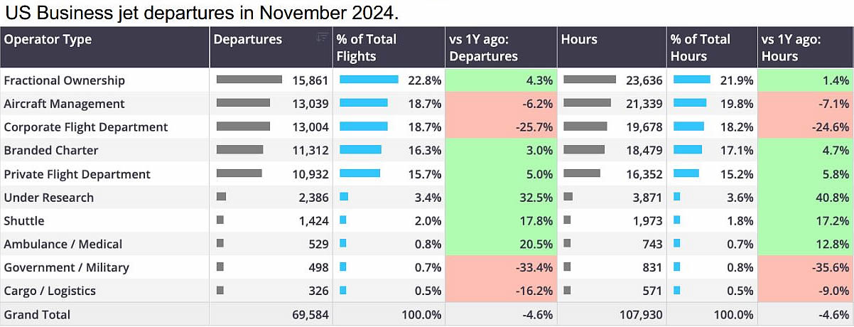 For the first 10 days of November, bizjet activity across the US is trending down. Corporate flight activity looks to have been put on hold until after the election result. Fractional flying is still forging ahead, with almost 25% of all sectors flown so far this month. The charter market also bumped up by 3 points. Private Flight department activity is trending up 5%.