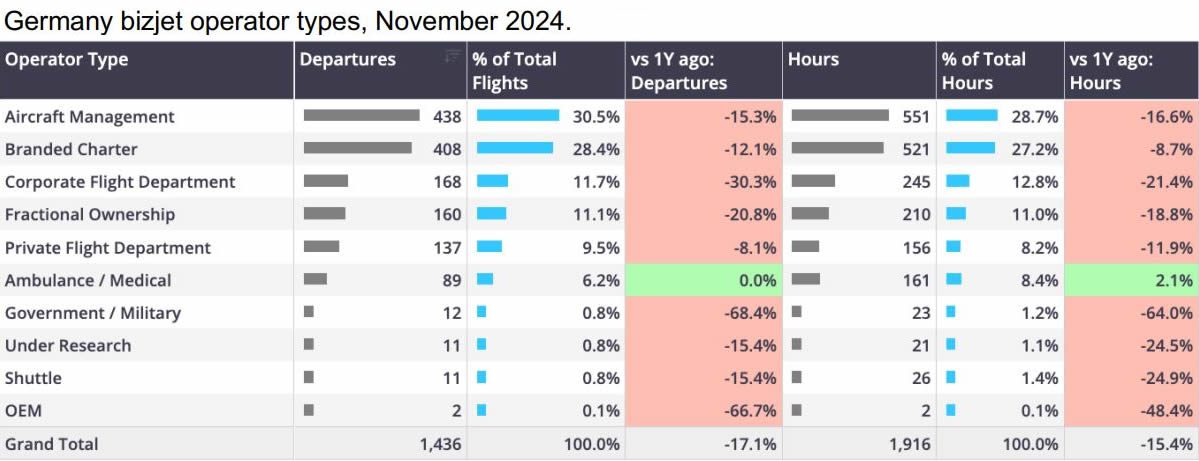 Business jet activity in Germany fell 12% compared to W45 in 2023, the 4-week trend is 5% below last year. Germany’s declines are even worse at the start of November, bizjet departures falling 17% compared to the start of November last year. Germany’s bizjet market has been in freefall most of the year, with pockets of growth centred around the hosting of the EUROS football in the summer. The bleak outlook is consistent across all operator types in Germany, worth noting that corporate flight department activity has fallen by almost a third compared to November last year.