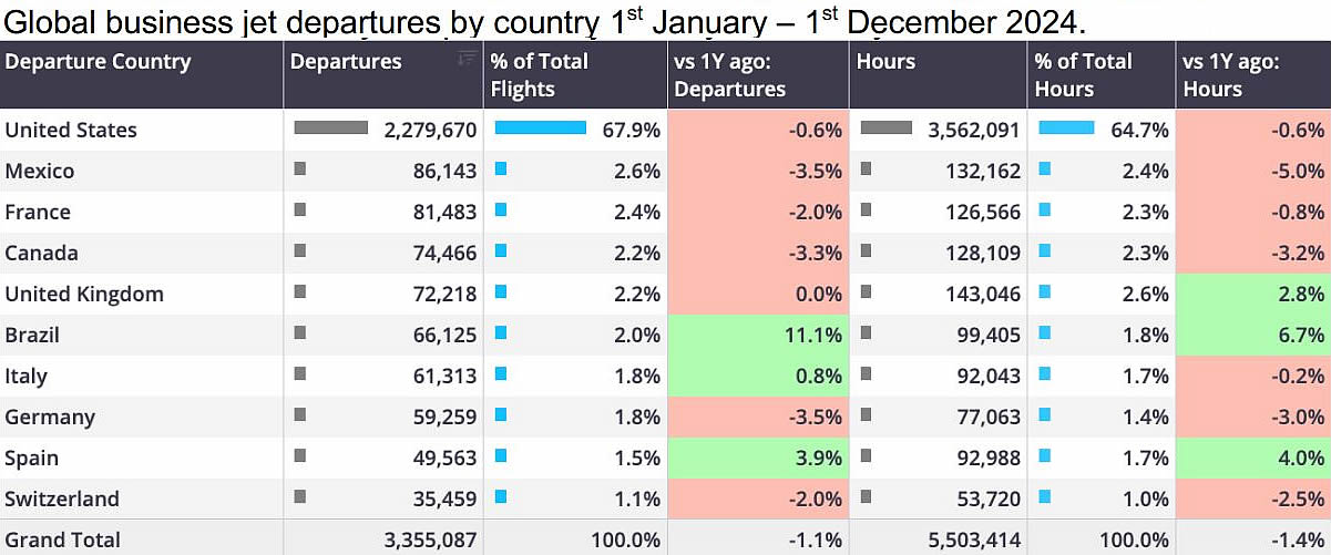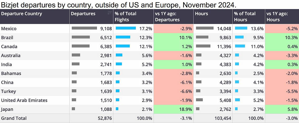Bizjet departures by country, outside of US and Europe, November 2024.