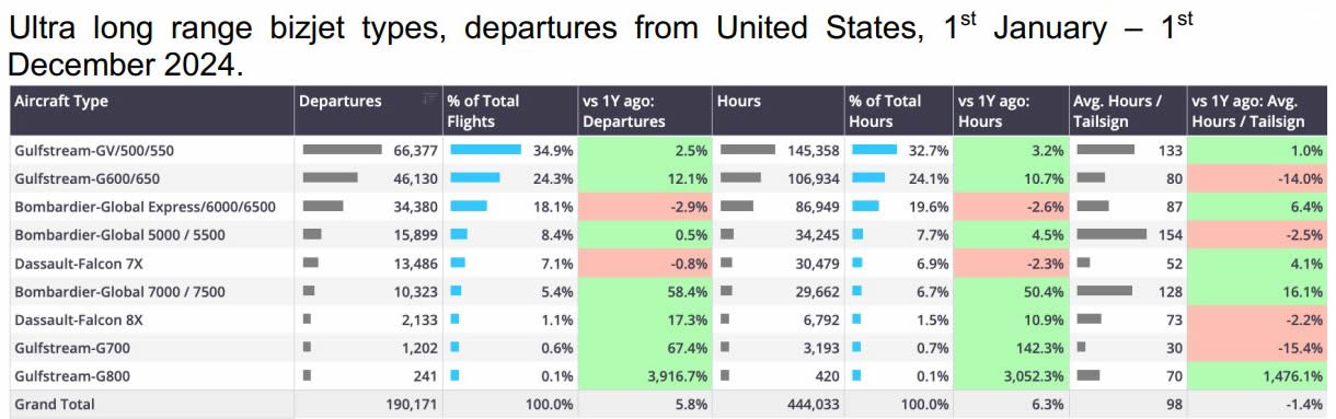 Ultra long range bizjet types, departures from United States, 1st January-1st December 2024.