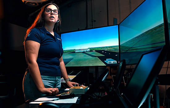 Embry-Riddle student Magdalena Kokenge performs an air traffic simulation exercise in the new Air Traffic Control Laboratory on the Prescott Campus. Graduates of the Air Traffic Management program can now be fast-tracked into towers for on-the-job training | Photo: Embry-Riddle/Connor McShane and Wilson Van Ness.