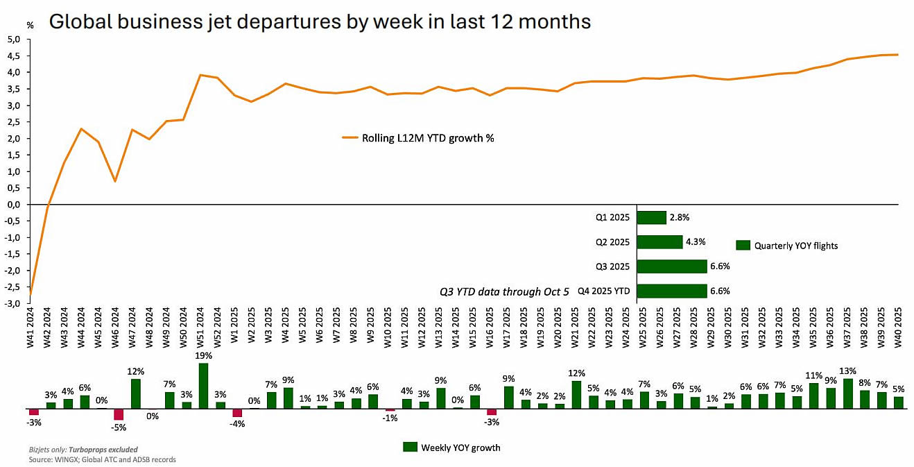 In Week 40 (29 September-5 October), global bizjet activity reached 75,651 departures, down 5% compared to the prior week (Week 39) but up 5% versus Week 40 of 2024. On a rolling last four-week basis (W37 – W40), global business jets have accumulated 314,000 departures, an 8% increase compared to the same period last year.