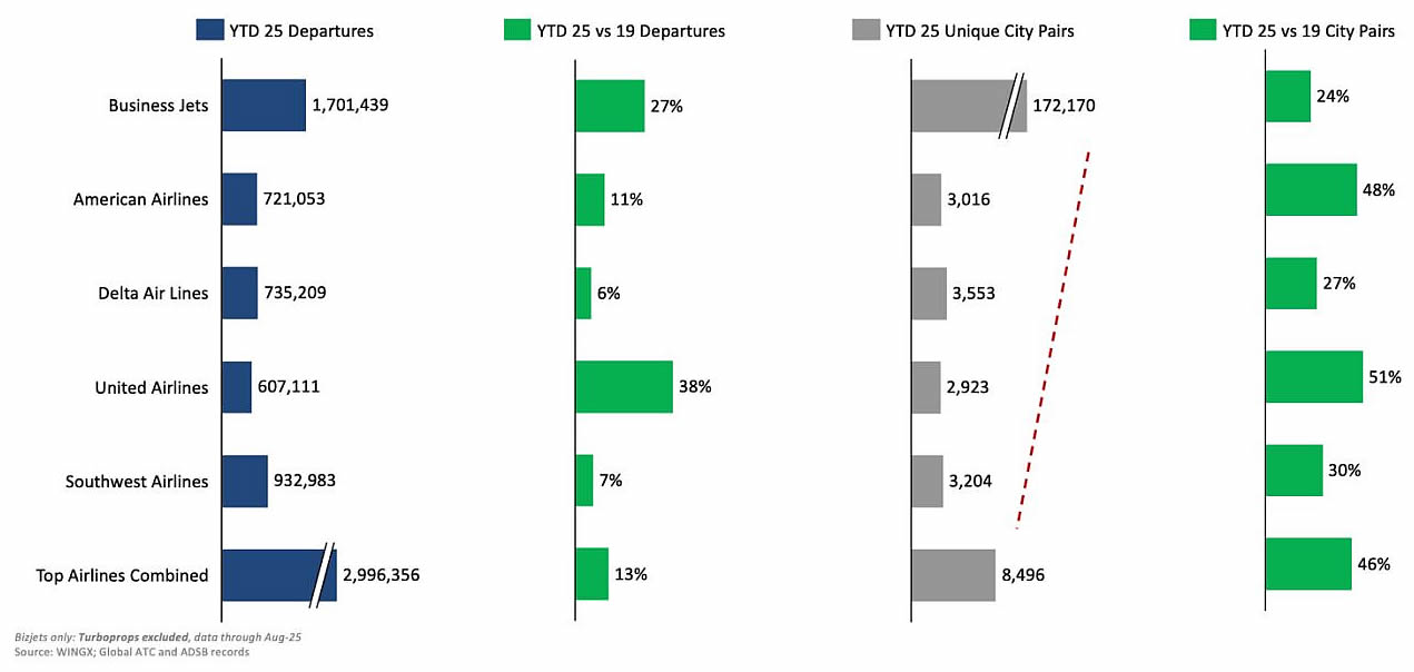 Q3 2025 shattered records with over 1 million departures, it became WINGX’s busiest quarter ever, up 6.6% from Q3 2024 and a massive 33% above Q3 2019’s 750,000 flights.