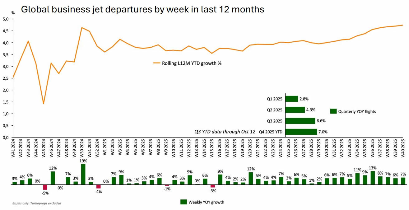 On a rolling last four-week basis (W38 – W41), global business jets have accumulated more than 314,000 departures, a 7% increase compared to the same period last year.