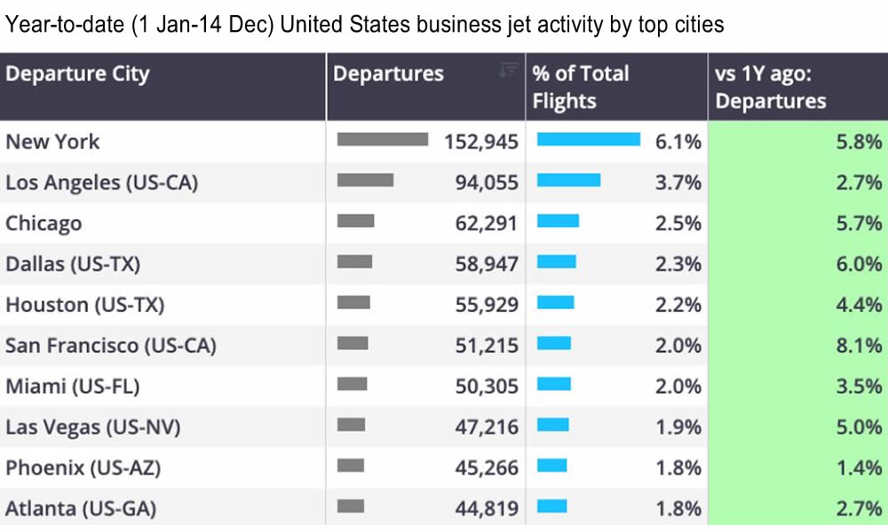 Year-to-date (1 Jan – 14 Dec) United States business jet activity by top cities.
