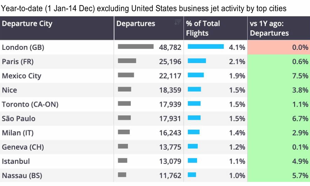Year-to-date (1 Jan – 14 Dec) excluding United States business jet activity by top cities.