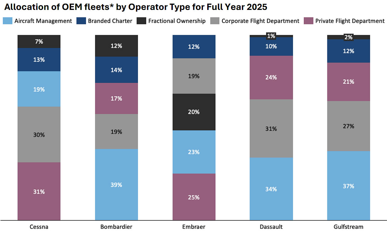 Branded charter operators show balanced presence across all OEMs, ranging from 10% to 14% of fleet composition, demonstrating the diverse aircraft requirements needed to serve varied charter missions and client preferences.