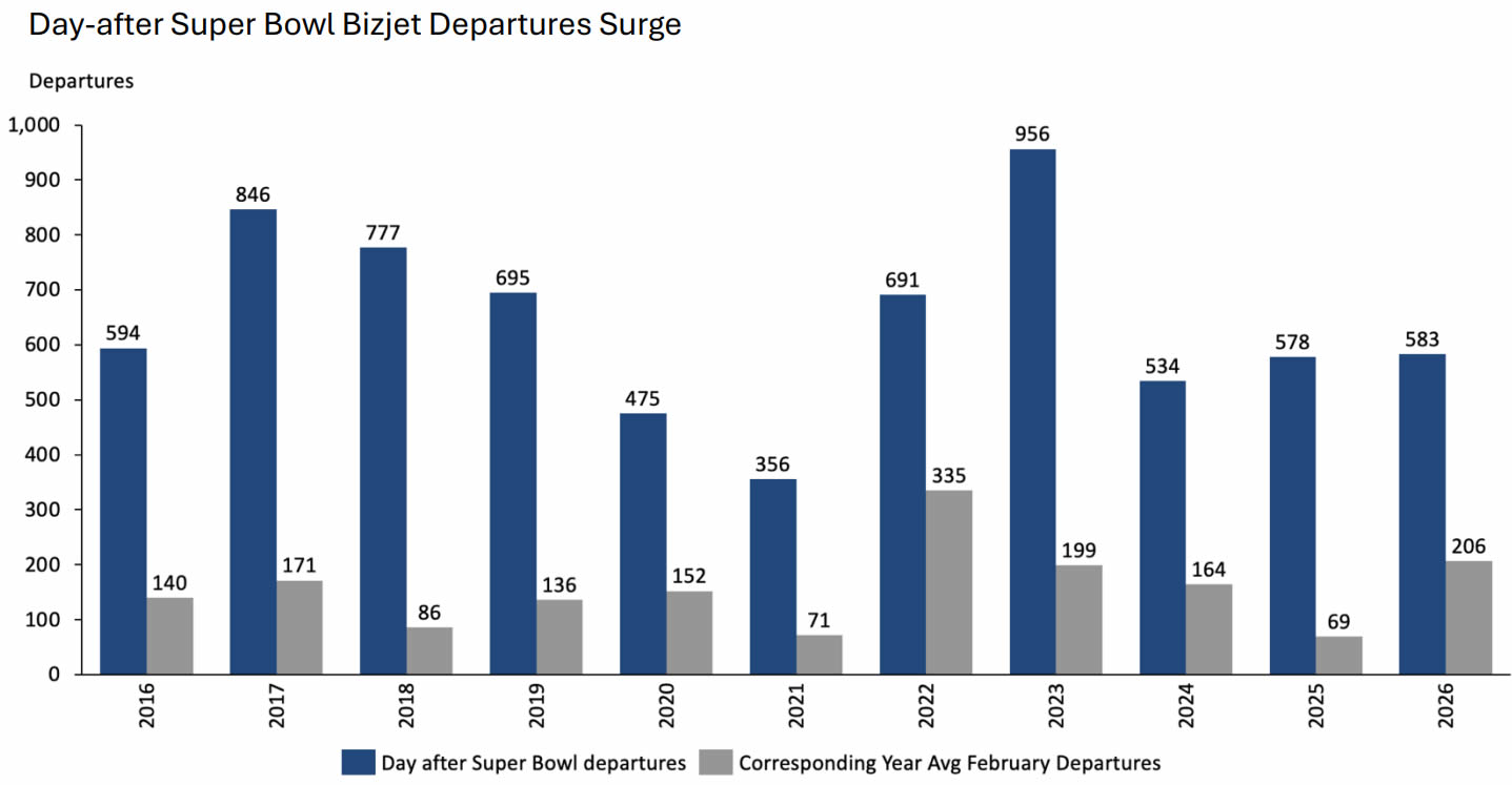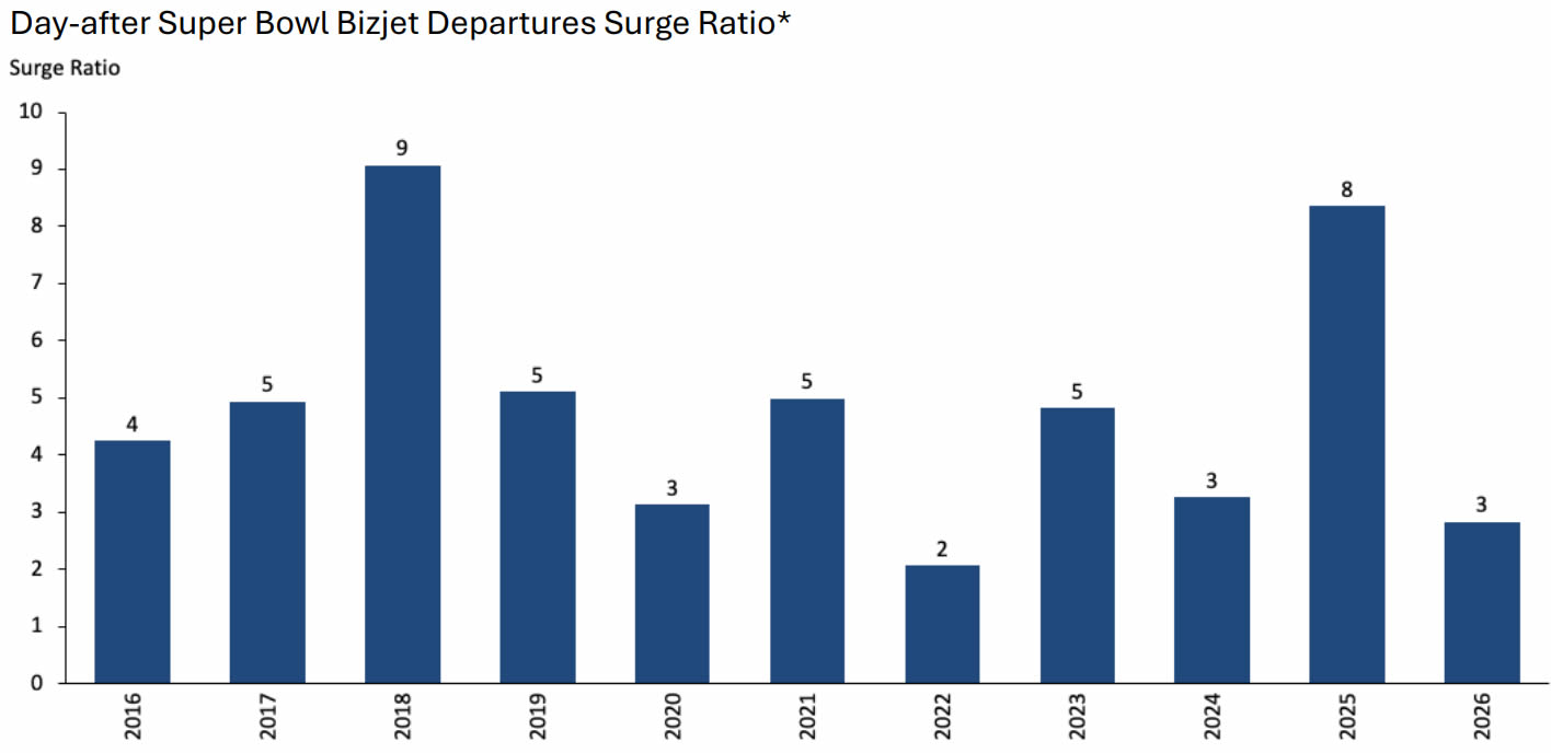 Day-after Super Bowl Bizjet Departures Surge Ratio*.