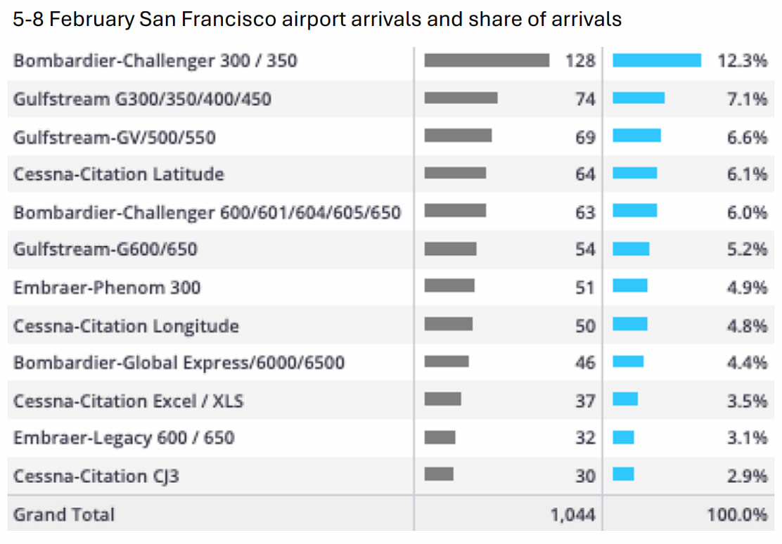 Aircraft type analysis of the more than 1,000 bizjet arrivals into San Francisco Bay Area airports from 5th-8th February reveals super-midsize jets dominated traffic, accounting for the largest share of arrivals. The Bombardier Challenger 300/350 led all aircraft types with 128 arrivals (12% of total traffic), followed by other super-midsize platforms including the Cessna Citation Latitude (64 arrivals, 6% share) and Cessna Citation Longitude (50 arrivals, 5% share).