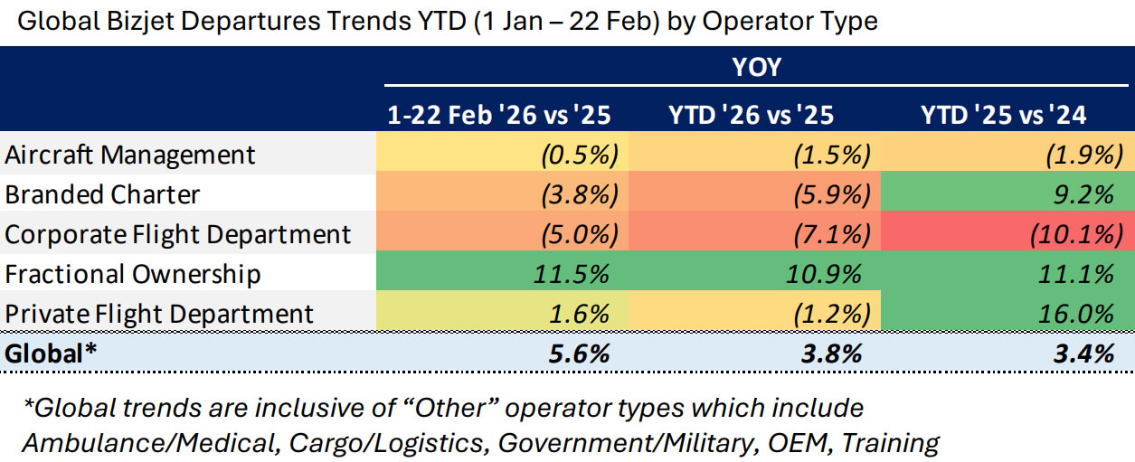 Global Bizjet Departures Trends YTD (1 Jan-22 Feb) by Operator Type.