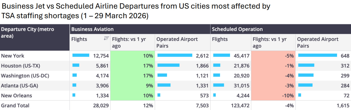 Business Jet vs Scheduled Airline Departures from US cities most affected by TSA staffing shortages (1st-29th March 2026).