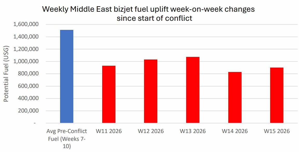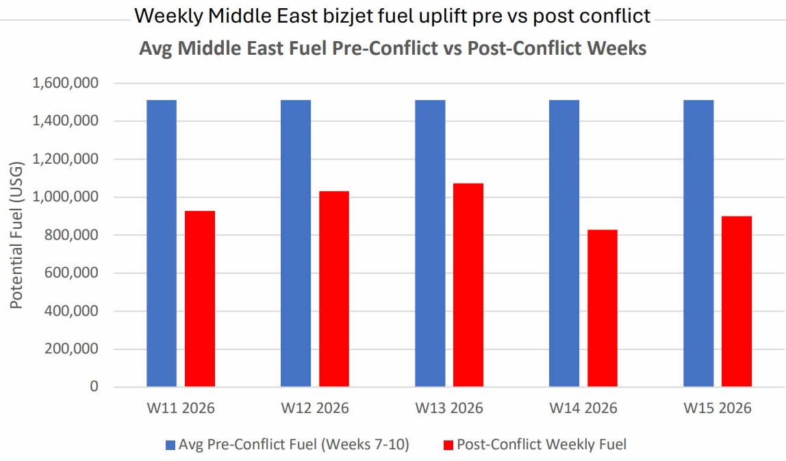 Weekly Middle East bizjet fuel uplift pre vs post conflict.
